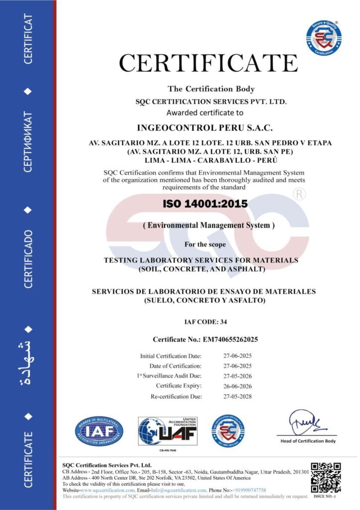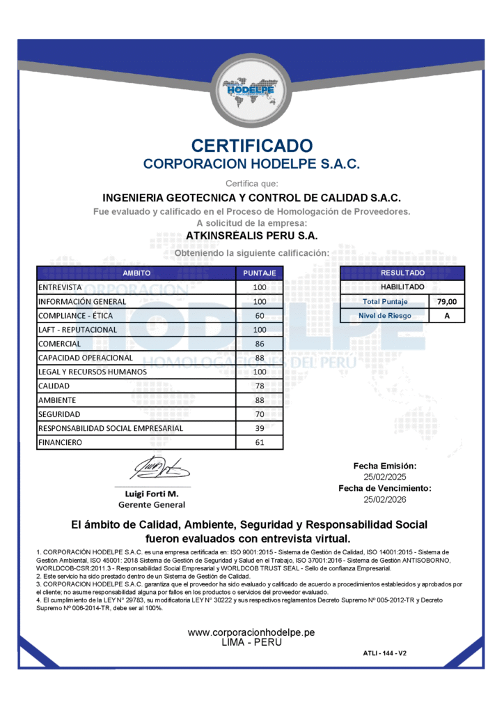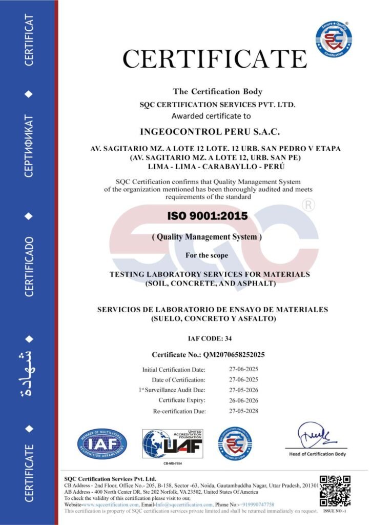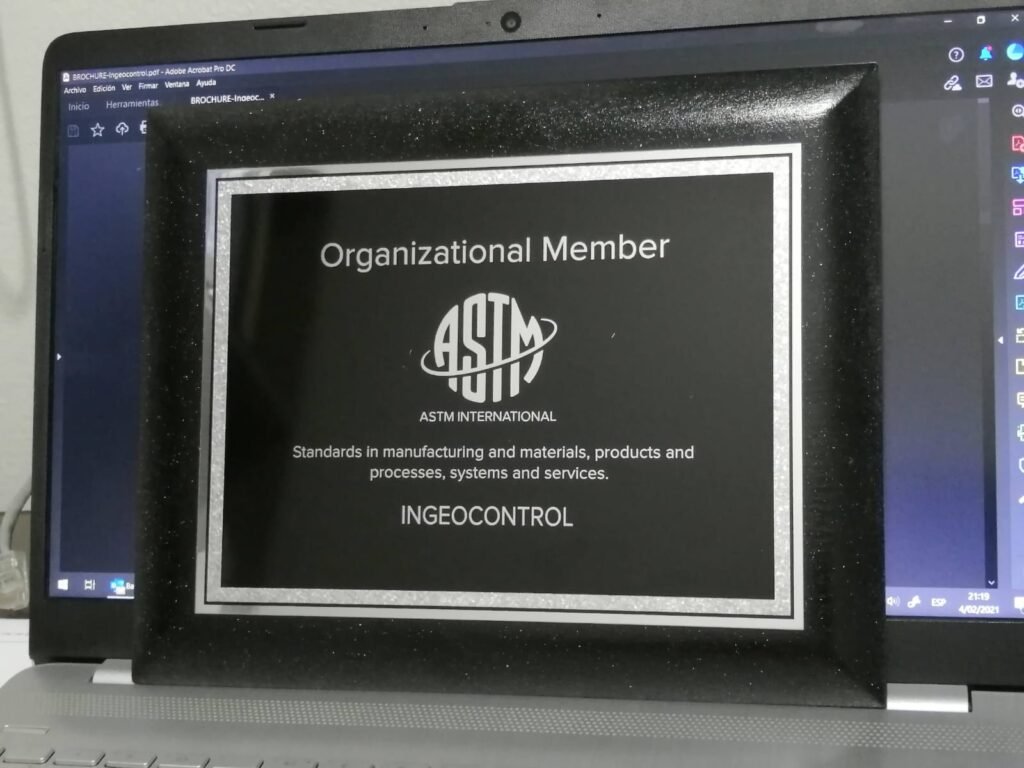 Membresía la cual nos mantiene informados de los cambios normativos en métodos de ensayo, aplicación correcta de cada proceso de ensayos en suelos, concreto, agregados y pavimentos.